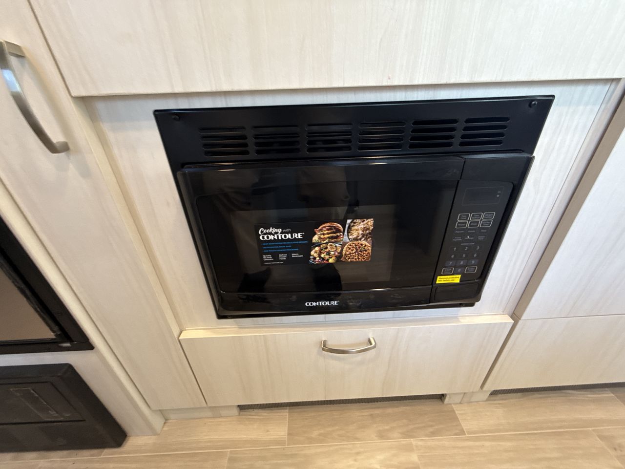 The kitchen is equipped with a two-burner stove, microwave, and a compact refrigerator, along with ample storage for cooking essentials. The U-shaped dinette serves as both a dining area and an additional sleeping space, accommodating up to four people.