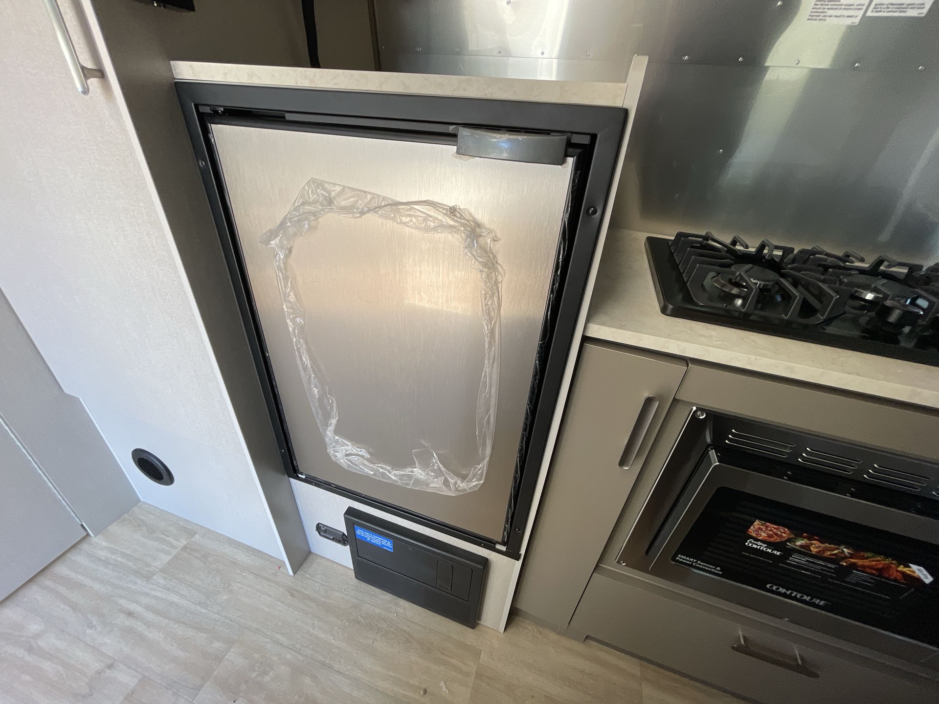 Measuring just over 22 feet in length, the 22FB is ideal for solo travelers, couples, or small families. The interior is thoughtfully arranged to maximize space, featuring a front bedroom with a comfortable queen-sized bed, overhead storage, and a wardrobe closet for your belongings.